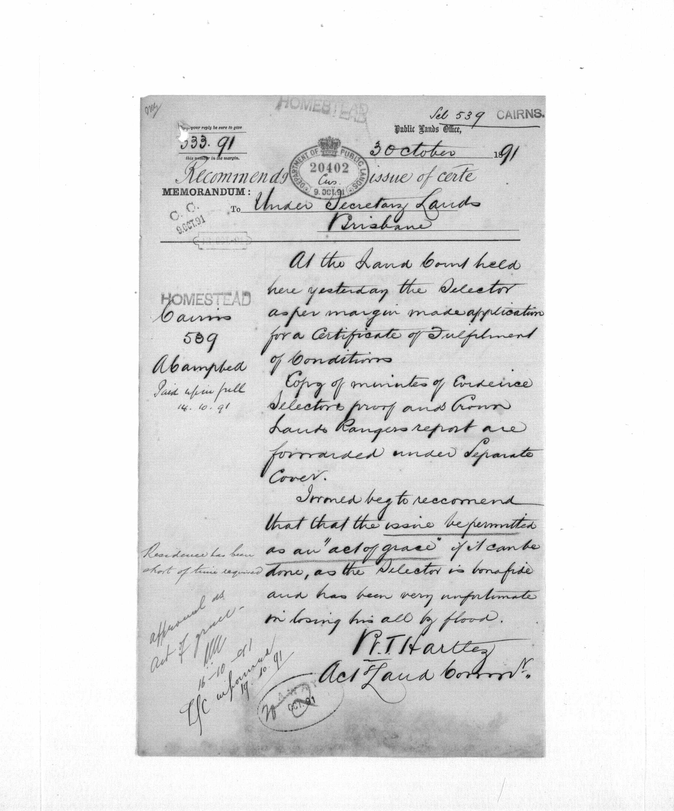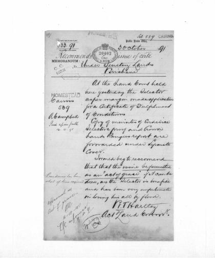 30 Oct 1891. Cairns Land Court recommends that Certificate of Fullfillment of Conditions be issued as an Act of Grace.
