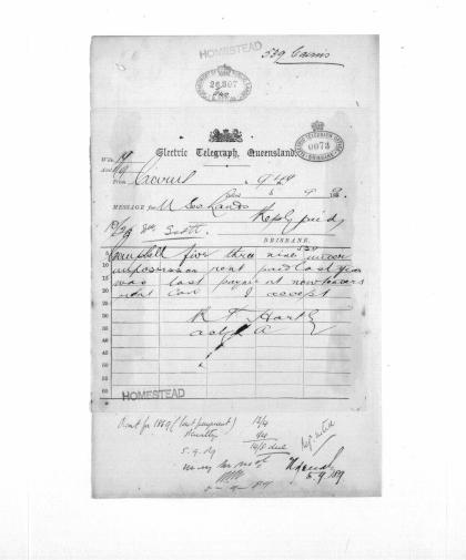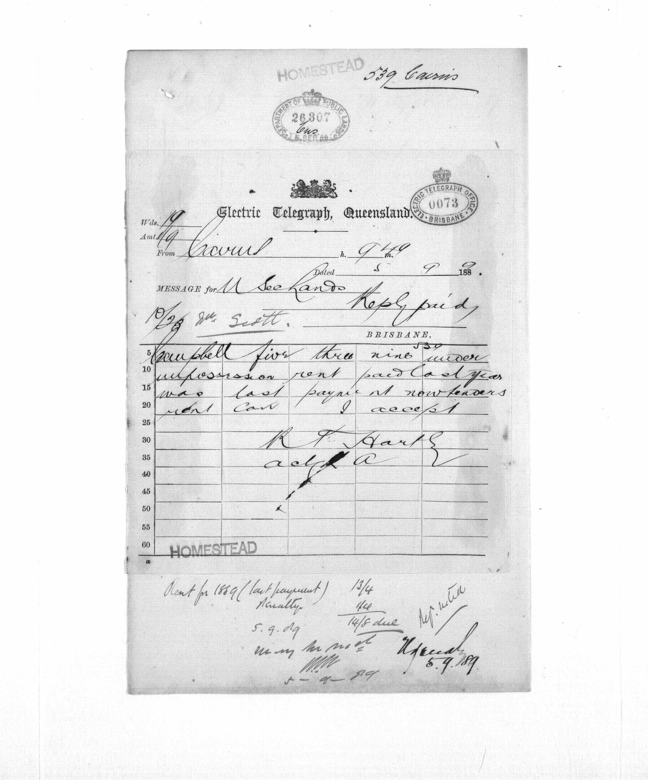 5 Sep 1889. Cairns Crown Land official asking Undersecretary of Lands in Brisbane if it is okay to accept very late payment of rent in arrears.