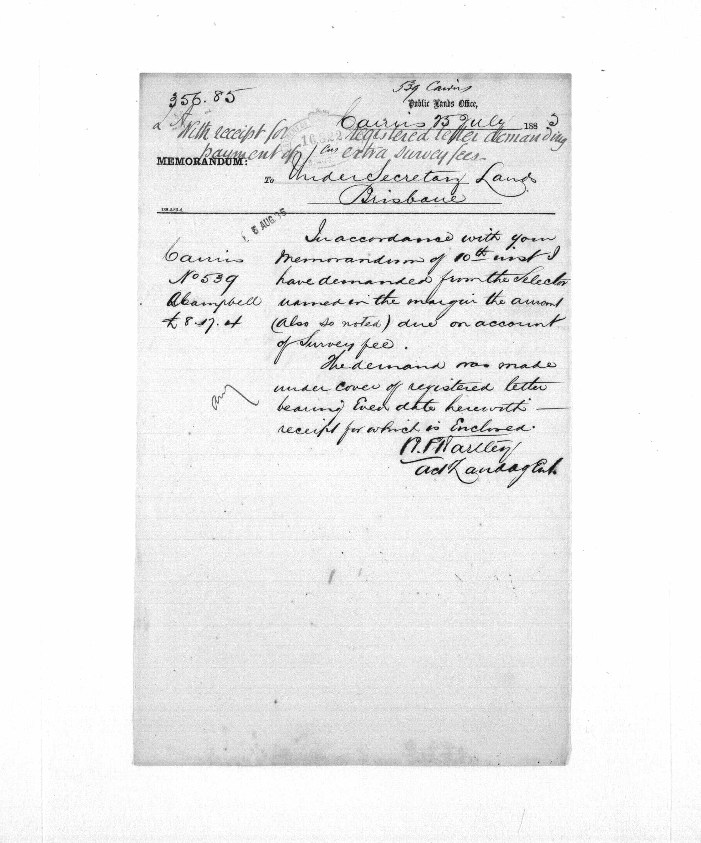 25 Jul 1885. Note that rent has been demanded from Alexander Campbell.