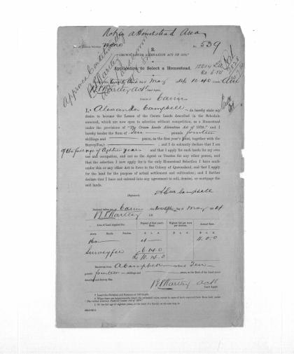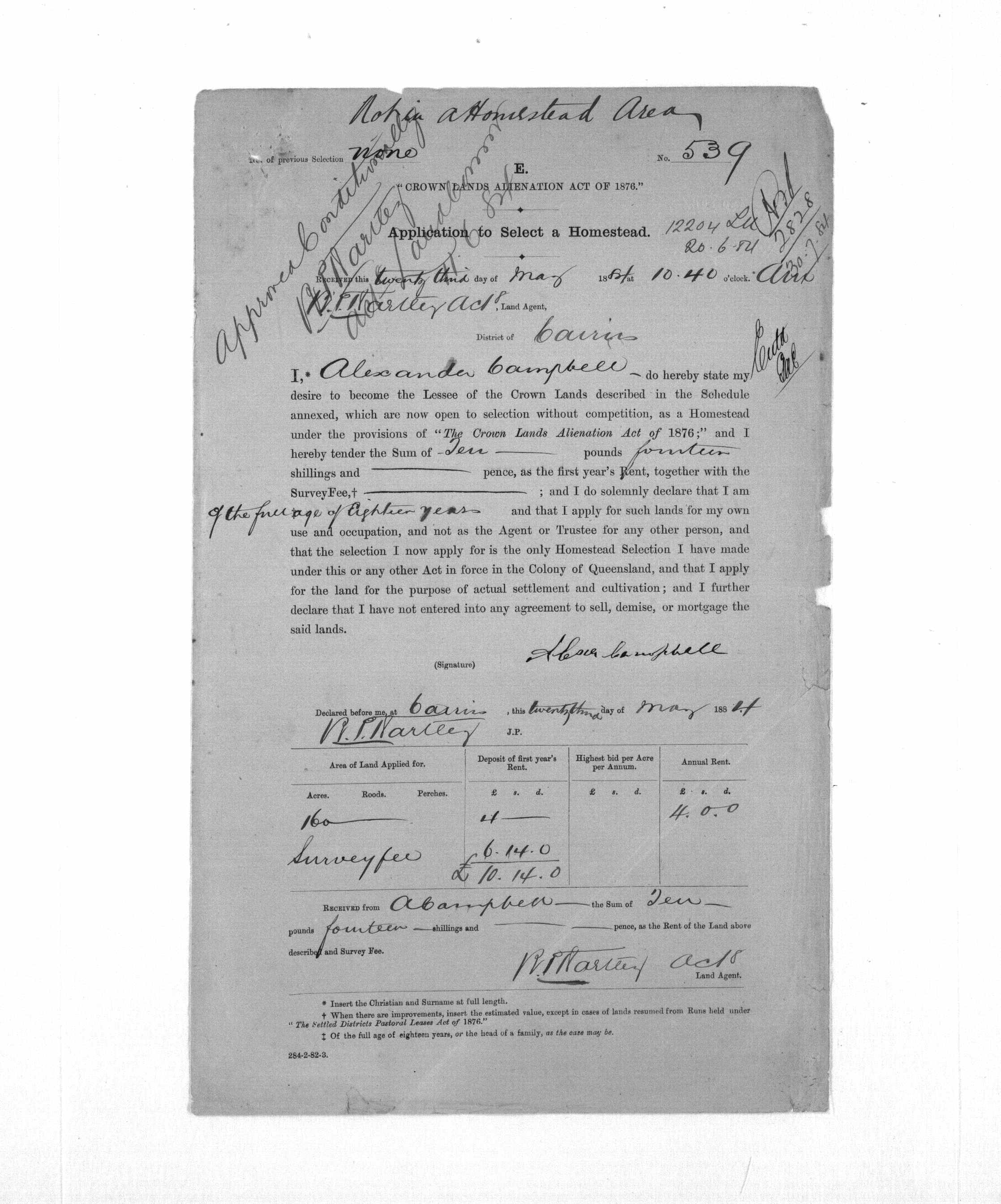 23 May 1884. Application to Select a Homestead, with Alexander Campbell's signature.