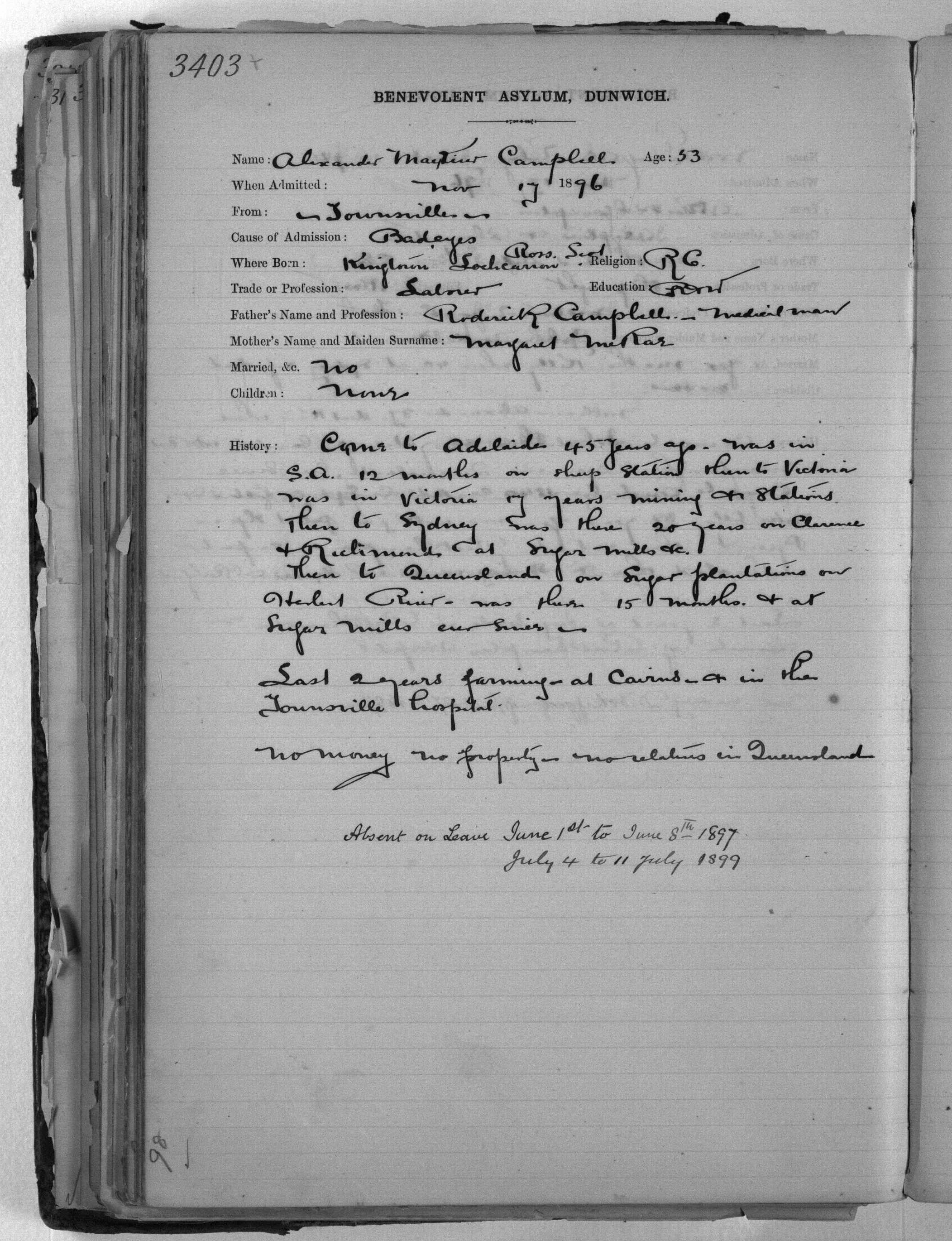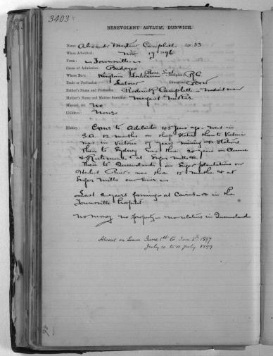 17 Nov 1896. Alexander McIvor Campbell Dunwich admission record. History transcription: Came to