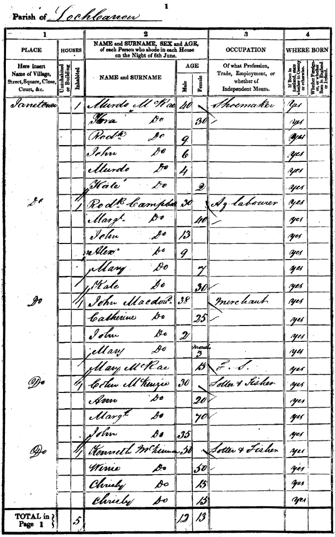 day of the 1841 Scotland Census. Her father Duncan is not recorded at their home in