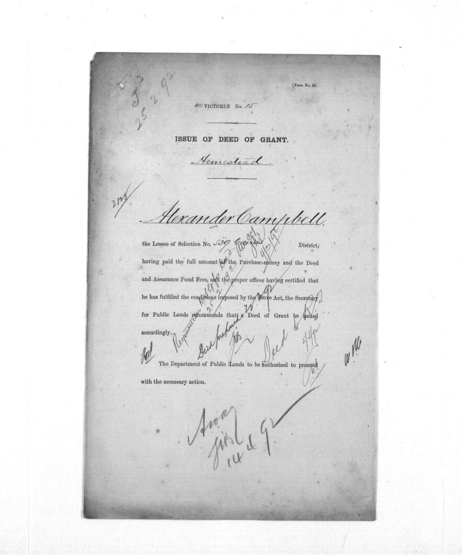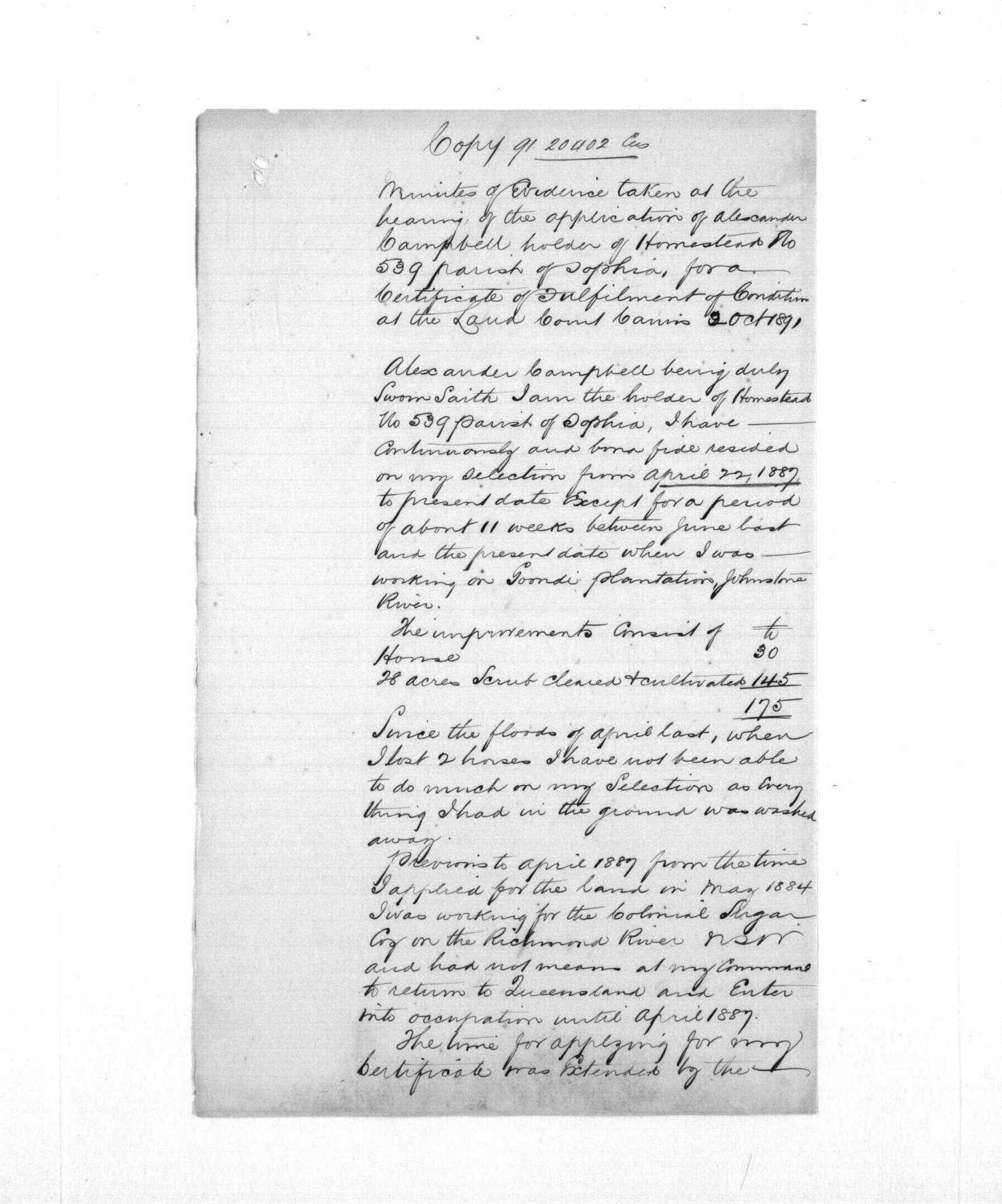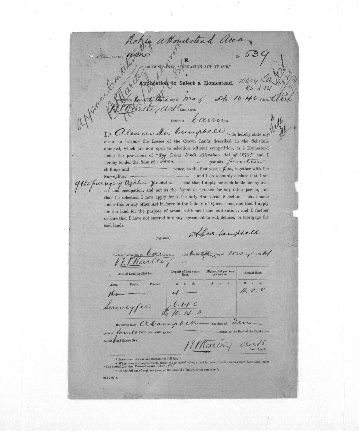 Alexander Campbell being duly sworn saith I am the holder of Homestead No 539 Parish of Sophia, I have continuously and bona fide