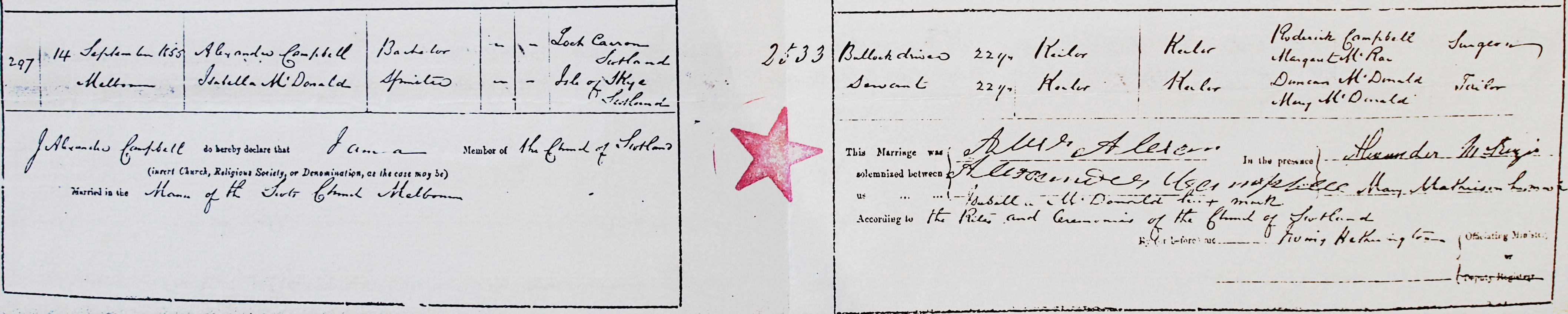 Alexander Campbell and Isabella McDonald's marriage certificate.