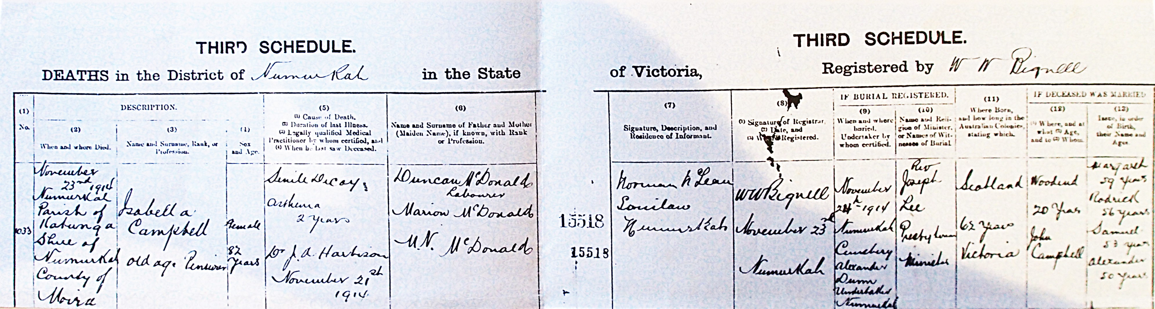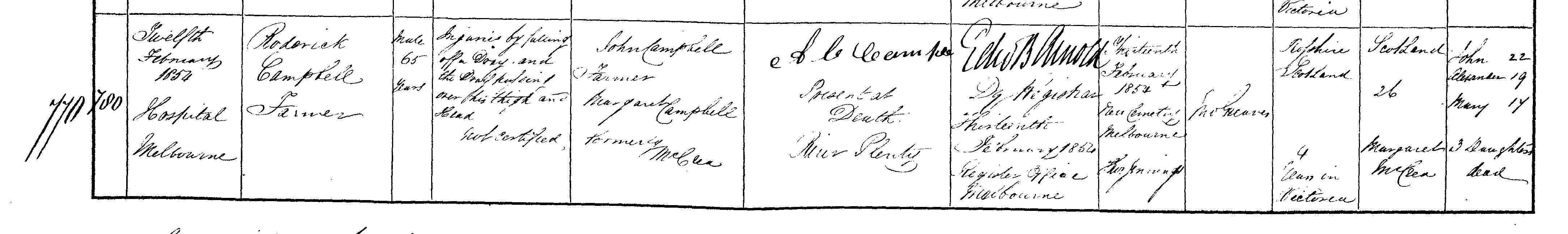 Three months later, on 5 April 1854, Margaret Campbell (nee McRae) died in Moonee Ponds. John Campbell signed as the informant on
