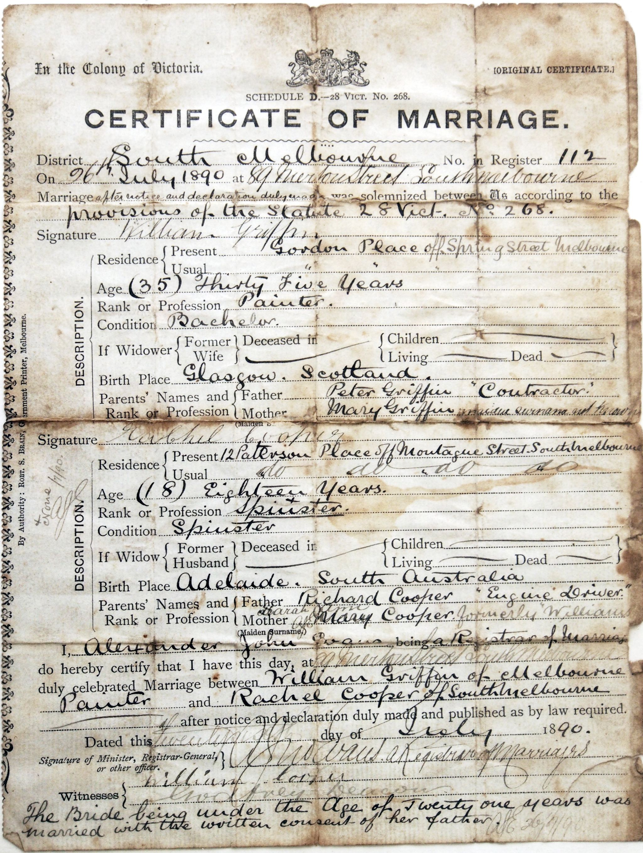 residing at the same address in South Melbourne on their marriage certificate.