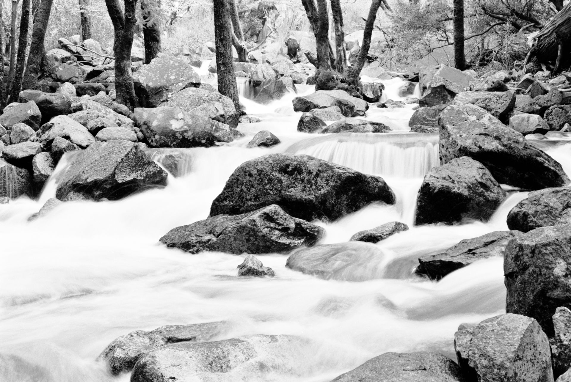 We travelled on a wet Monday just before Christmas so there weren't a lot of people around when we got to Yosemite. There had been a lot of rain the week before so all the waterfalls were running hard. I set up my camera on a tripod at the edge of Bridalveil Creek and took a long exposure of the stream.
