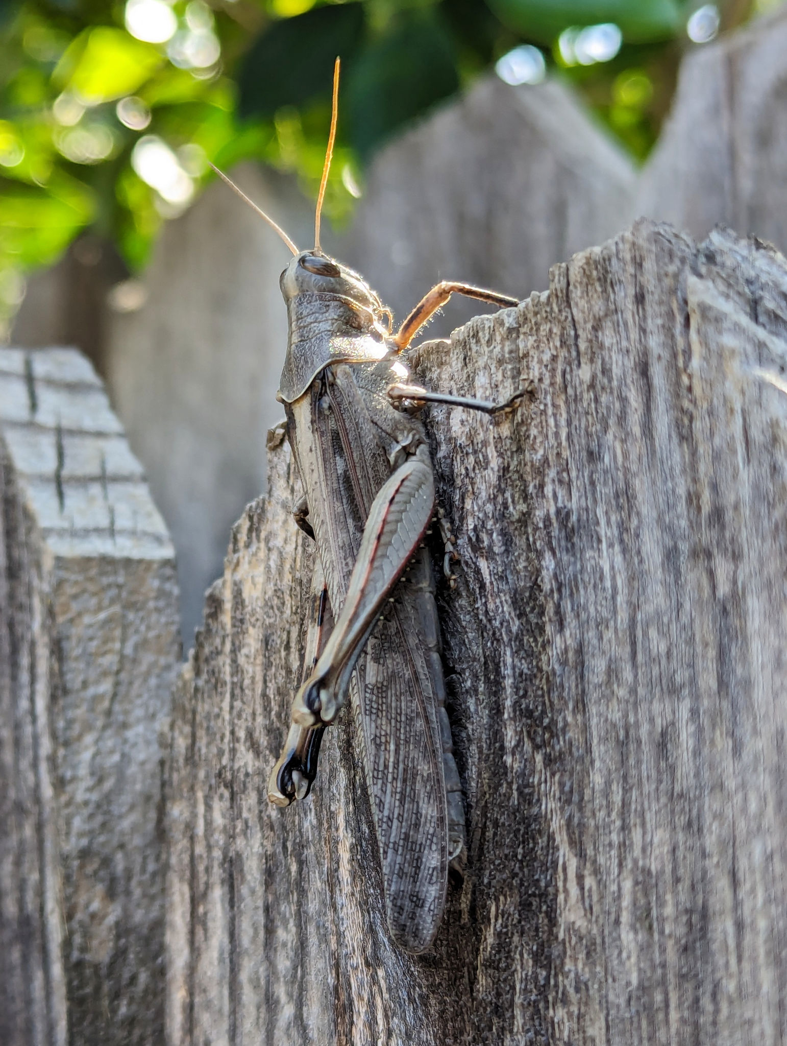 This is one of the largest grasshoppers I've ever seen. It blended nicely with the backyard fence.