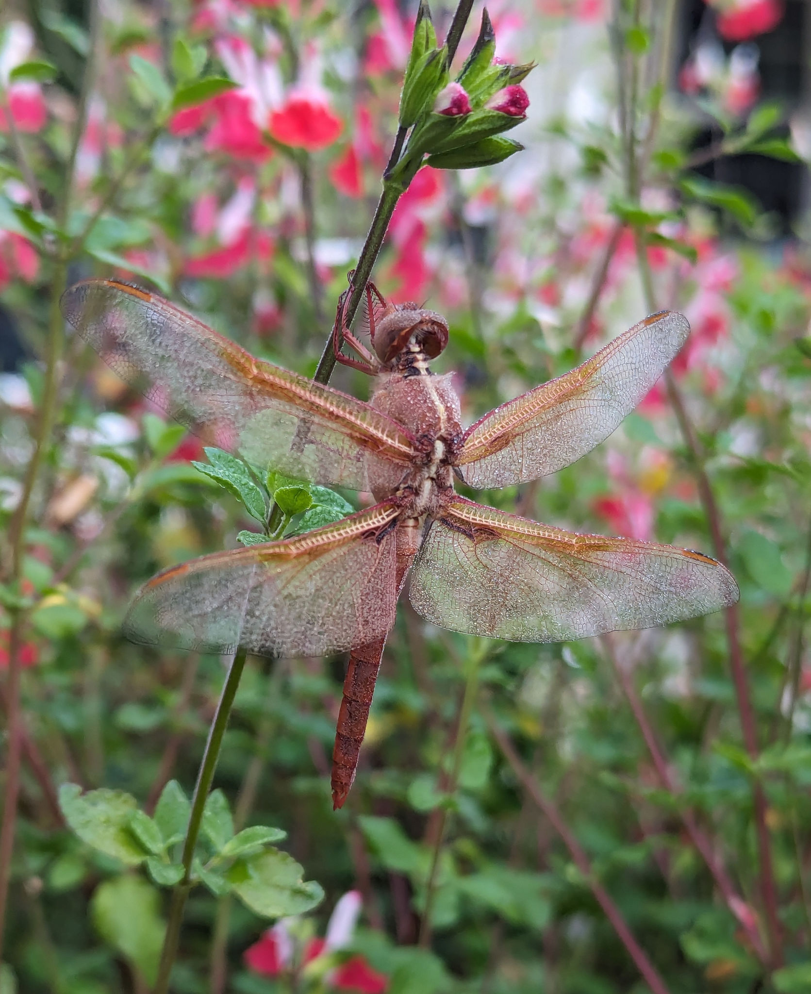 Home, and the garden is in full bloom. This dragonfly might be hunting the many bees visiting this shrub.