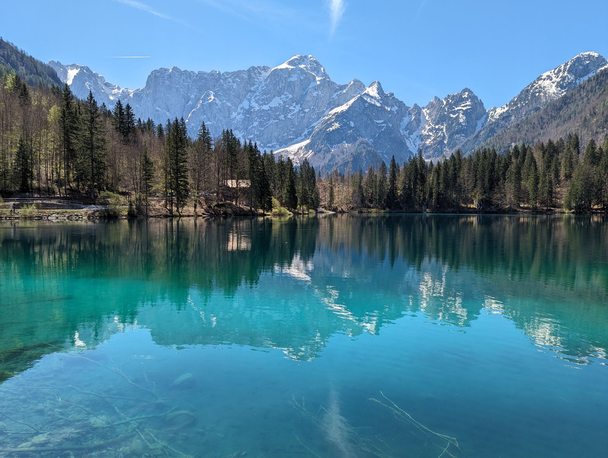 The impossibly beautiful view of the Julian Alps from Lago Inferiore di Fusine.