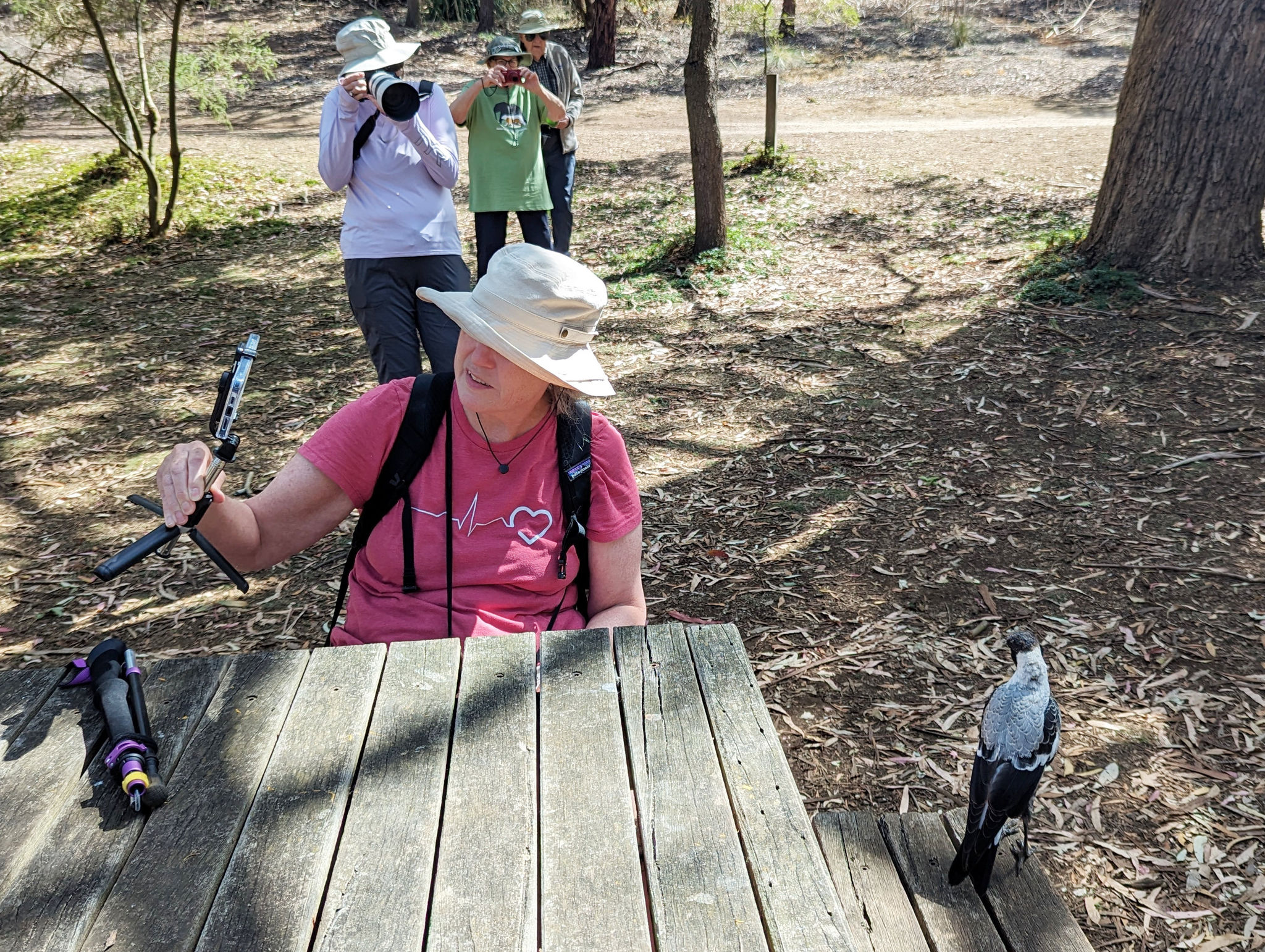 Weekly Ludwig family zoom call at a picnic table in the Tower Hill Wildlife Reserve. Magpie superstar.
