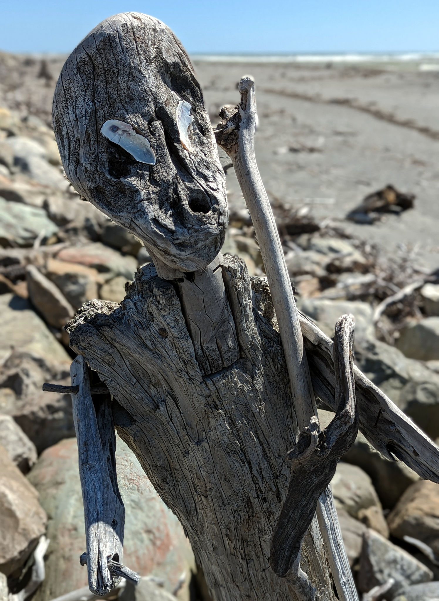 Driftwood sculpture on the beach at Hokitika. A screaming southerly that day.