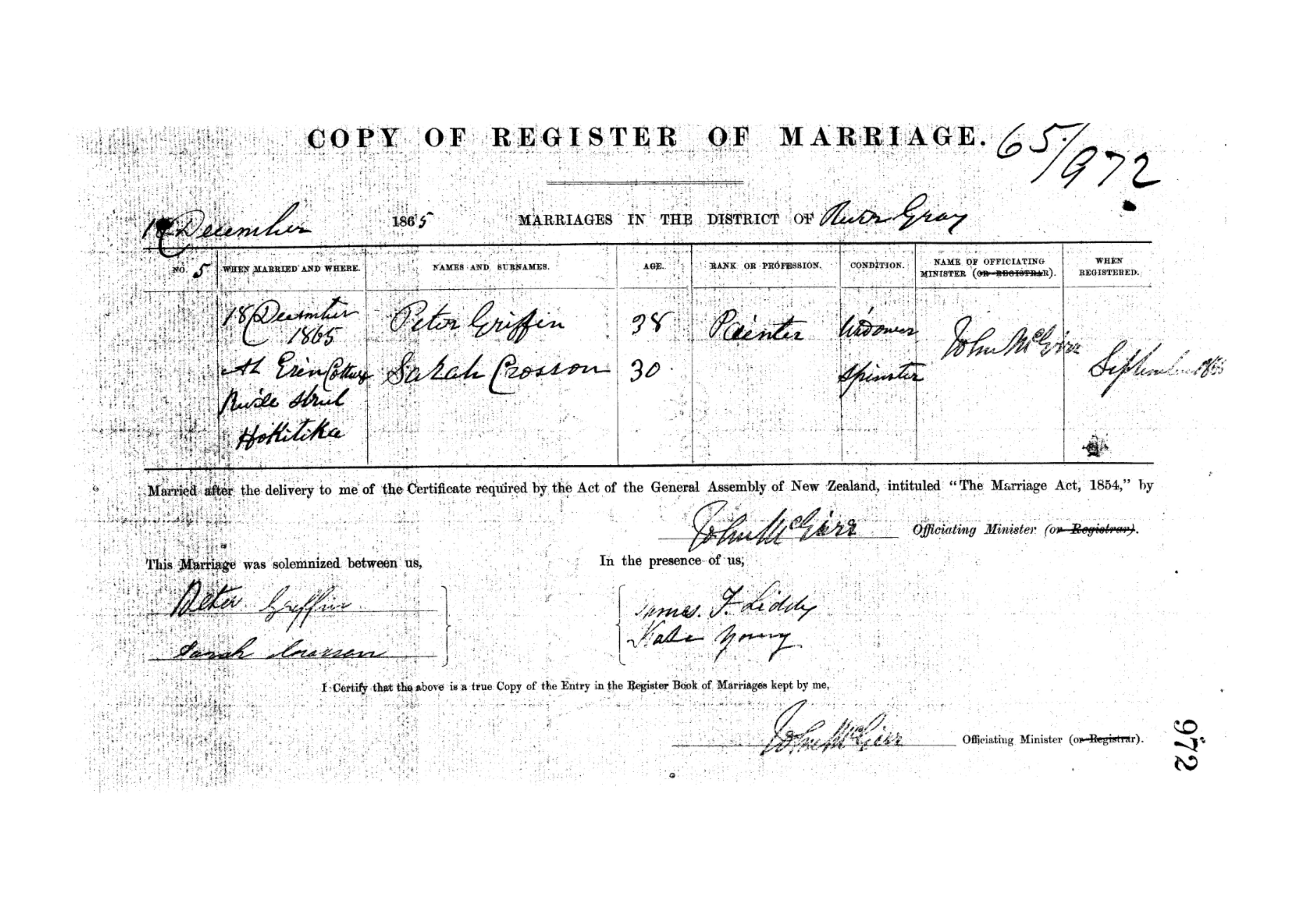 Hokitika (his occupation was frequently listed as "Slater and Painter" after this). On 18 December 1865 Peter Griffin married Sarah Crosson in Hokitika.
