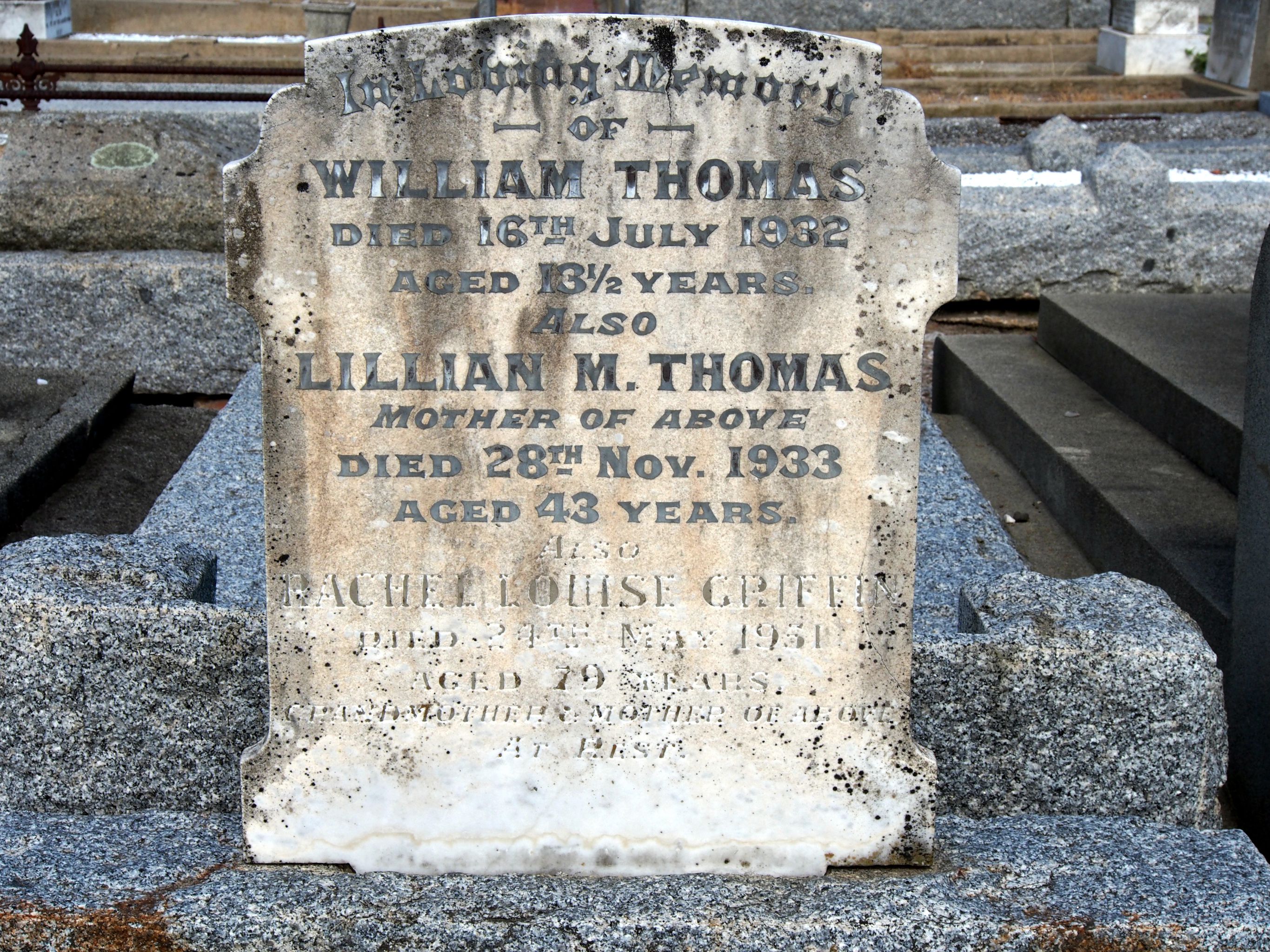 Brighton Cemetery in a plot shared with her daughter Lillian May Thomas (nee Griffin), and Lillian's son William Henry Charles Thomas who had both predeceased her.