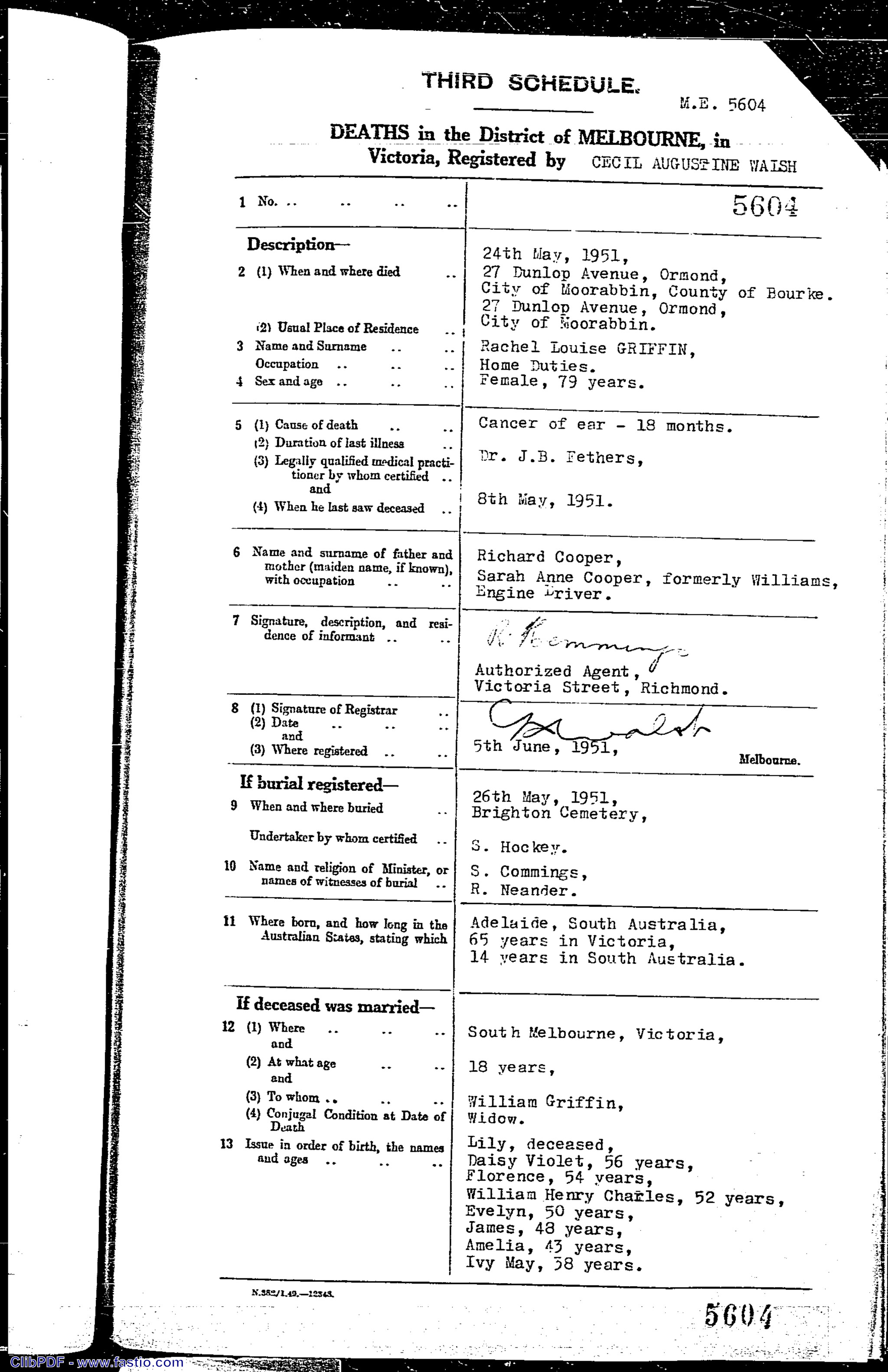 On 26 July 1890 in South Melbourne Rachel Louisa Cooper (aged 16) married William Griffin (aged 40). William gave the age of 35 on his