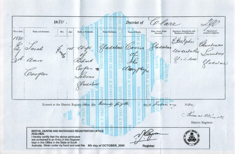 Slightly more than three months after his wife's death, on 5 June 1880, Richard Cooper remarried in Gladstone. Richard's new wife was