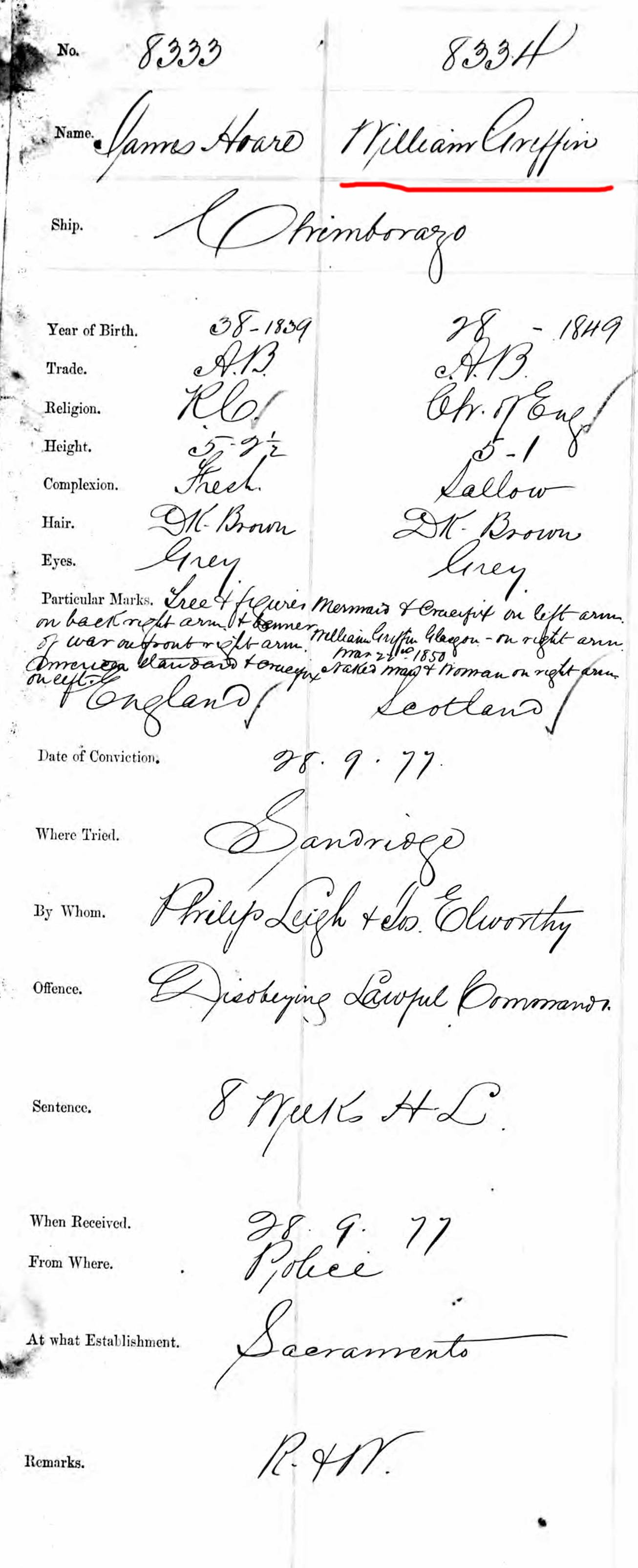 William Griffin returned to Australia in 1877. Family oral history says that William "jumped ship" on arrival to Melbourne. The 28